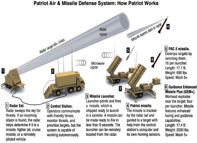 The Patriot missile system has a remarkable goal to target. It is designed to detect, target and then hit an incoming missile that may be no more than 3 to 6 meters long and is typically flying at three to five times the speed of sound. The upgraded Patriot system can also destroy incoming aircraft and cruise missiles.